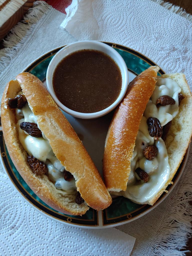Morel Dip: Reconsitute Morels 20 min. saute in butter 5 min. add more broth saute 5 more min. leave on simmer. Toast hoggie rolls add your choice cut of meat spoon out morels place on top of beef, place provolone cheese on top return to oven for 2 min. slice in half. add scallion onions to morel sauce. pour into small dippin bowl. Mmmm good.